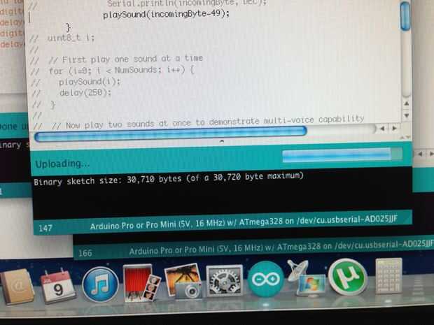 Encontré un pedazo de código Arduino llamado BeatVox, que jugó tambor PCM suena con un similar sano método de generación de Auduino. He intentado muy duro conseguir trabajar en el misma Arduino Mega que ya estaba usando. Hubiera sido genial. Pero en última instancia, simplemente no pude hacerlo, existía demasiada va en, o que no era lo suficientemente bueno. Comencé a considerar alternativas. Escribe: El Arduino Pro Mini.