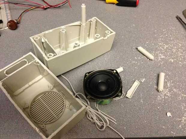 que había comprado el Sparkfun Mono Audio Breakout Junta porque no tengo ninguna experiencia aún construyendo mi propio amplificador. No tenía ninguna razón para no usarlo. Era bastante barato, fácil de usar, sonaba buena y familiar a mí. Requiere un altavoz de 8 ohm. Decidí que quería 2 altavoces por equilibrio. Así que necesitaba dos altavoces de 8 ohmios en paralelo o dos altavoces de 4 ohmios en serie. Que era otra quest en sí mismo. Después de muchas pruebas, finalmente me decidí por algunos altavoces de ordenador Altec Lansing que tenía puesta alrededor. Al parecer no tenía un largo/flaco suficiente destornillador para conseguir los altavoces abrir limpiamente, así que tuve que abrazar la mediocridad con una sierra para metales: