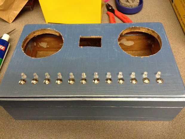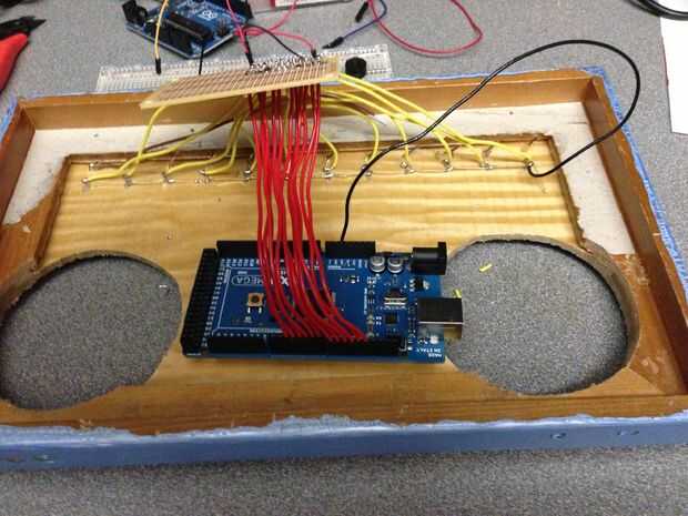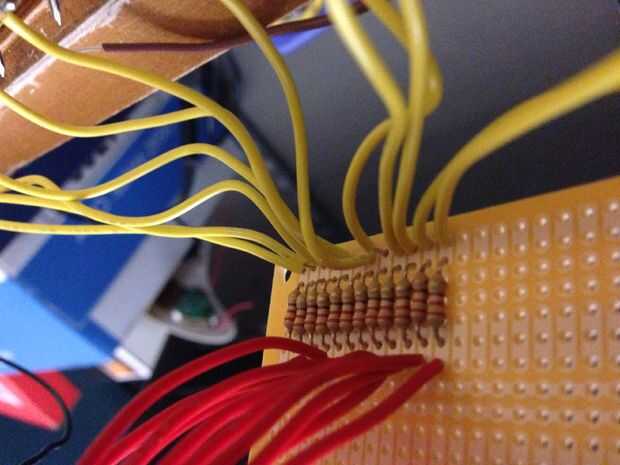 Porque al tener los claves clavos roscados en, mi papel ahora era inútil. Tan sólo ojos el espaciado y alineación (EM) y había perforado 2 pequeños orificios verticalmente unos ¼" encima de cada tecla. Usé una 1/16 broca para perforar hacia fuera. Estos serían los agujeros que a través de ánodo y cátodo de cada LED. Poner un poco de adhesivo de uso general en la parte inferior de cada una y les equipadas, luego deje que se seque durante la noche. Una vez seco el pegamento, inclinó cada cátodo (-) sobre en la misma dirección para que se tocan y los soldados. Al final os adjunto un cable de tierra. I al otro cable de cada ánodo, los soldados y había limpiado para arriba. Luego empecé a armar la junta principal que se conectaría a todo.
