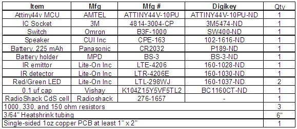 Piezas: me gusta Digikey (http://www.digikey.com/) a pesar de su intimidante catálogo. No estoy asociado con ellos, pero ellos me han dado buen servicio. Te proporciono los números de parte. Sustituir a su propio riesgo. La única parte que no me de Digikey fue la fotocélula. Fue de RadioShack. Me avisas si encuentras algo que funciona! Un buggy "RS libre" sería genial. Hay alrededor de $7 o $8 en partes por error, pero usted querrá hacer un par por lo que no esté solos. Digikey tiene un $5 dirección de pedidos bajo $25 que no debería ser demasiado difícil de evitar.