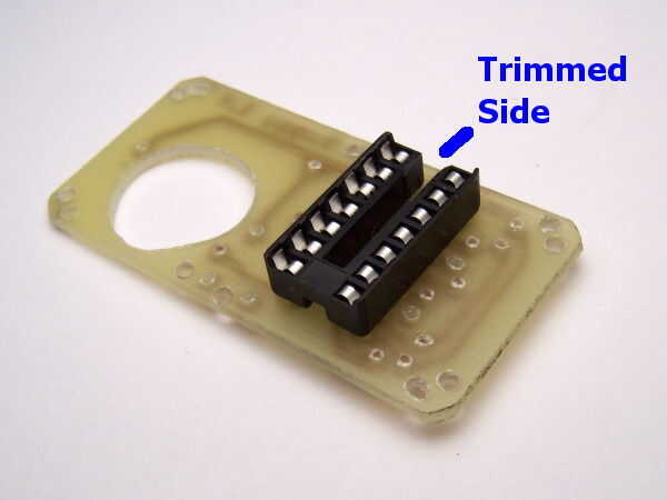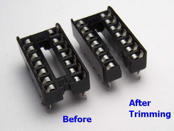 Es necesario recortar el zócalo del chip un poco primer. Hacer esto antes de que la soldadura en. Escapó un par de resistencias por debajo de la viruta, por lo que la toma tiene que ser recortado para que encajen. No una gran idea, pero funcionó. Usar una Dremel con un corte y recorte la sección mantiene los lados juntos al final "hoyuelos" (ver foto 1).