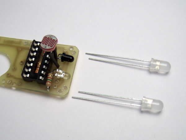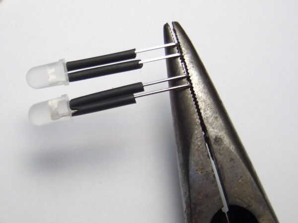 Sólo asegúrese de tener las piernas largas de los LEDs para el exterior (ver figura 1). Puse el termo retráctil en las piernas y dejarlas largas por lo que se puede mover alrededor de este último. Para conseguir igual, sosténgalos juntos y poner una curva de 90 grados en todas las piernas al mismo tiempo con los alicates (cuadro 2). Caer en los agujeros correctos (pata larga en el exterior).