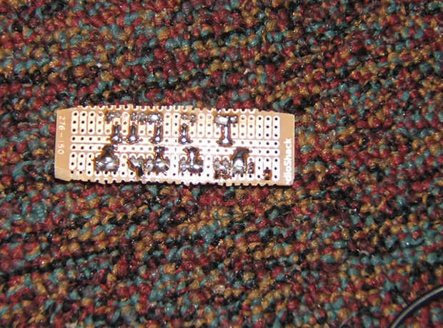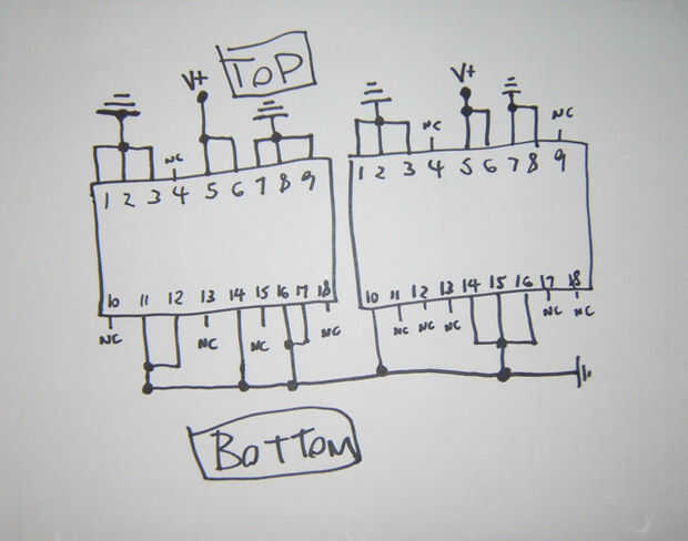 Una vez que estés seguro de que el cableado es correcto, podría quitar el segmento de muestra (dejando todo el cableado en el lugar de referencia). Ahora empezar a soldar las pantallas en el tablero de PC del estilo de cuadrícula para que la parte superior de la pantalla permite la conexión de un cable en cada uno de los registros. No te preocupes del fondo la mitad. La parte inferior la mitad es un montón de conexiones que esencialmente están conectados a tierra. El enfoque de este es puente todas las conexiones de tierra con soldadura y luego puente estas conexiones en el registro medio. Las conexiones de V + se agrupan en dos conjuntos de dos en la parte superior y deben ser superadas juntos para hacer dos juegos. Estos conjuntos deben conectados entre sí por un hilo en la parte superior y luego conectados por otro cable al darse de alta en el lado de la Junta.