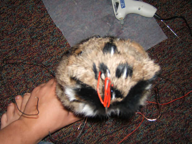 Último, vas a querer un agujero pequeño en la parte superior de la cabeza de la lechuza detrás de su oreja derecha. Pasar un alambre largo rojo y negro a través de este orificio y, finalmente, a través de la base de la lechuza. Doblar el alambre para que nunca pueda caer a través de su cabeza.