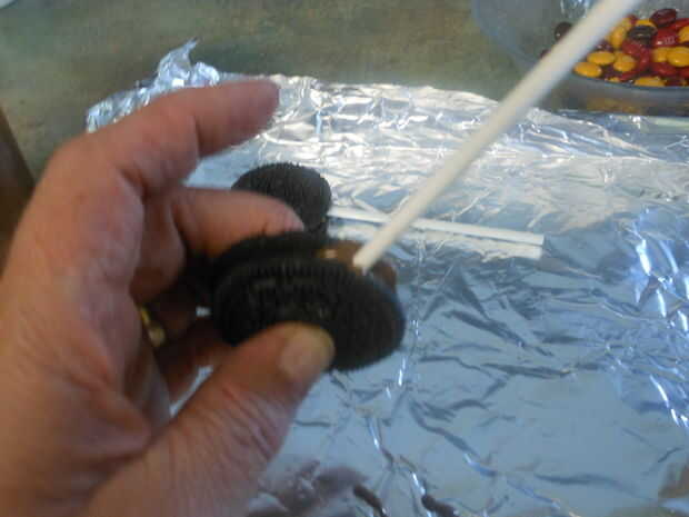 Derretir el chocolate se derrite según las instrucciones del paquete.  Que mina atascado en el microondas durante 60 segundos y revuelve.  Estaba totalmente derretida.  Sumergir el palo de ventosa en el chocolate derretido y luego pegarlo entre las capas de las galletas Oreo.