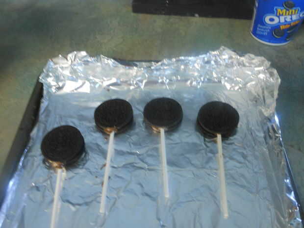 Poner la cookie en el palillo sobre la hoja.  Deje que el conjunto chocolate derretido hasta que duro, a la velocidad, que esto se puede poner en la nevera durante 10 minutos.