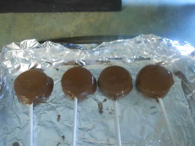 Mojar la galleta en el palo en el chocolate derretido.  Deje tanto por goteo como sea posible.  Pone en la hoja.