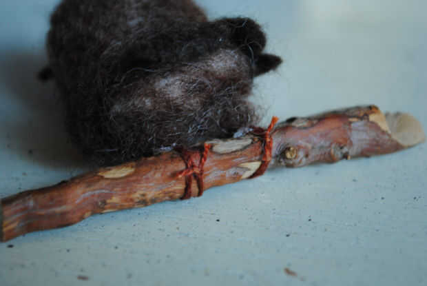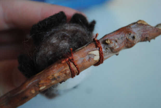 Mi siguiente paso fue hilo marrón alrededor de una rama para una percha triple (para tres dedos) y lo apaga. Luego pega caliente del búho a la perca.