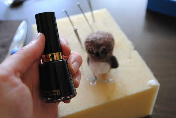En la imagen el último paso, el búho tiene patas de alambre. Como se mencionó, opté por ir para piernas de hilo en su lugar. Corte los pies y curvó las piernas de alambre hasta en el cuerpo con unos alicates y torcido. Les cubrí en lana.