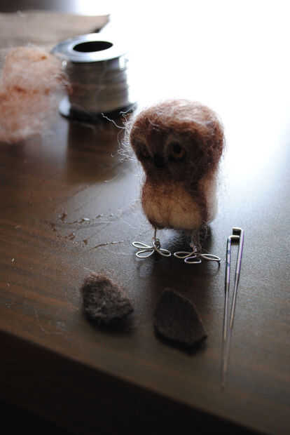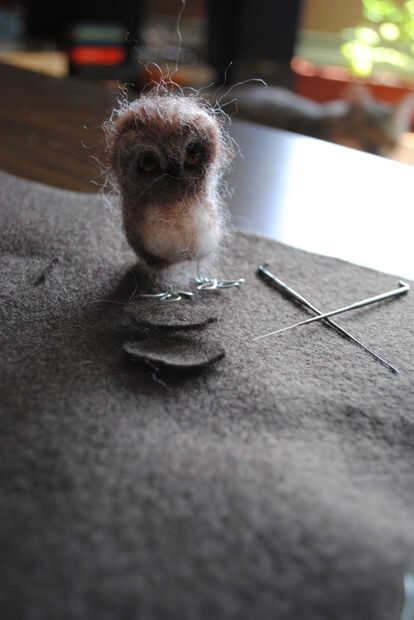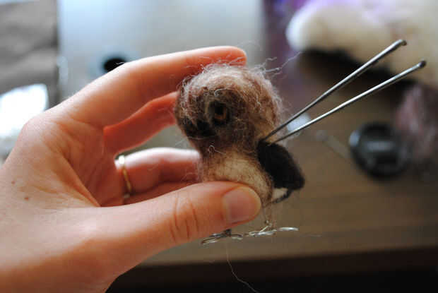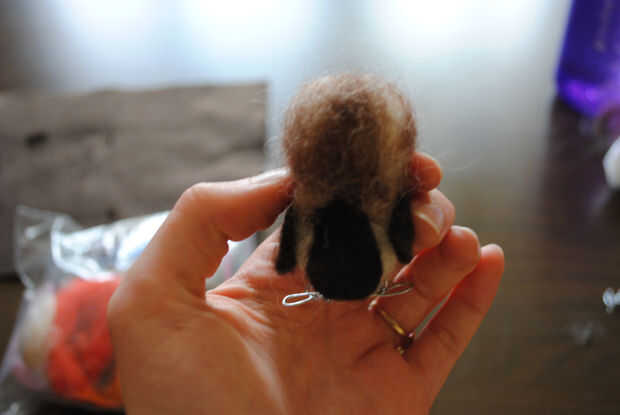 Utilizando una hoja de fieltro marrón, cortar dos alas y la cola. Les sentía directamente en la parte superior y los lados con un 42 pero no sentido sobre como dejar un "lift". Asegúrese de que pueden resistir un tirón ligero antes de pasar.