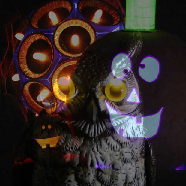 Ya teníamos planes para 5 calabazas de LED, soltando de Raffi recién buho cantar a lo largo de la canción creó la necesidad de animar rápidamente un búho de plástico jardín Dalen para Halloween. Aquí el búho de ojos de LED lleva una banda de 5 calabazas de LED. Voz por la gran bombilla de luz LED calabaza, acompañados de dos LED parpadeantes calabazas y la cortesía de Snap-O-linterna pequeña la EvilMadScientist.com. La rotación es la gran calabaza de lata pastel, un trabajo en progreso.