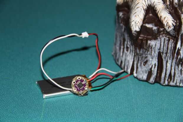 Cables del positivo y negativo fueron soldados a cada uno de los dos blancos LilyPad LED disponibles de SparkFun. Observe que el LED de LilyPad ya tienen resistencias en su pequeña, redonda tablero de PC. Un agujero de 1/8 de pulgada nominal fue perforado en el plástico detrás de cada ojo extraíble en el buho Dalen. Los cables pasa por el cuerpo hueco del buho y soldados en un chip de LilyTiny en la conexión de #0 que proporciona una acción de atenuación/parpadeo preprogramada. Una batería recargable de litio (3,7 v) fue utilizada para la energía para el chip LilyTiny.
