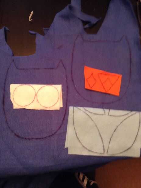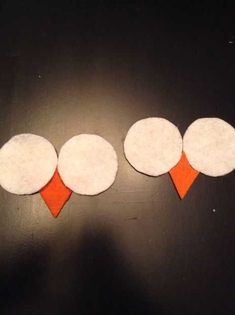 Trazar las plantillas sobre la tela y cortar. Ahora es el momento de decidir cómo desea que su pico (es designada "la nariz"). Opción uno tendrá parte del pico anclado bajo los ojos. Opción dos, no tendrá. Utilizaré a opción dos. Cuando usted corta el cuerpo, cortar 1/4 a 1/2 pulgada desde la línea que trazó. Esto se llama "margen de costura." Se necesita un color de cuerpo, color de las alas, naranja para el pico, blanco para los ojos y negro para las pupilas.