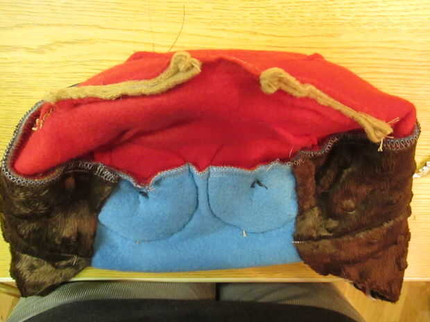 Girar el sombrero de dentro hacia fuera y alimentar fondos de oído para arriba a través de ranuras, que se extiende más allá. Cosa una costura continua, captura todo.