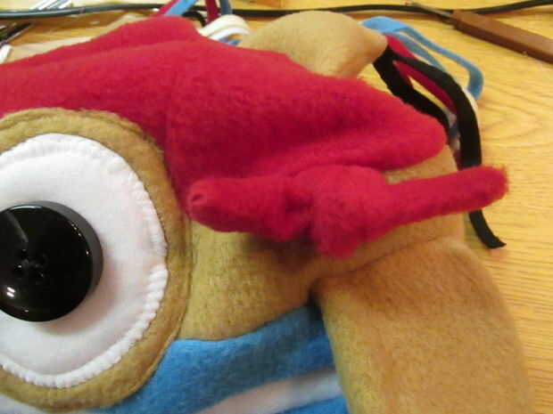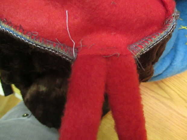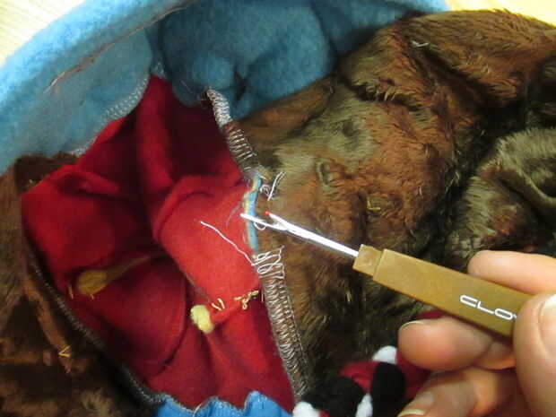 Utilizando a un descosedor, abrir parte de la costura serged dónde se echaron en la parte interior y cosido. Hacer esto desde el exterior, sólo romper todos los hilos desde el interior. El vellón es muy fácil de rasgar con un descosedor porque la costura es tan apretada.