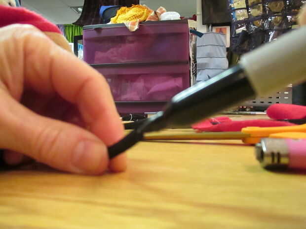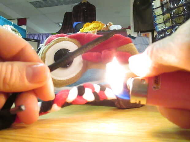 Después de decidir la longitud adecuada que debe ser, corta, sharpie y queme ligeramente. Que tenga que practicar un par de veces antes de que usted sólo suficiente derretir sin quemarse a través de la capa negra, exponiendo el blanco. La longitud adecuada del cordón depende de fijación parche sobre el ojo y atar alrededor y detrás de orejas y atar un nudo cuadrado.