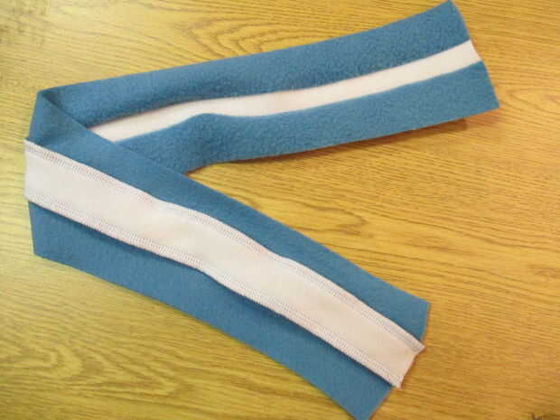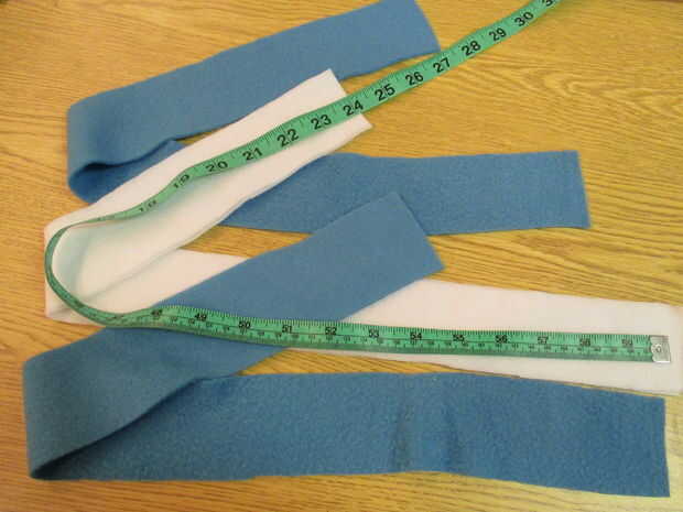 Cortar 2 tiras de color azul y 2 de la blanco, 2 "x 24". Hay sólo una raya blanca, pero el blanco Vellocino era delgado así que quería doble para arriba.
