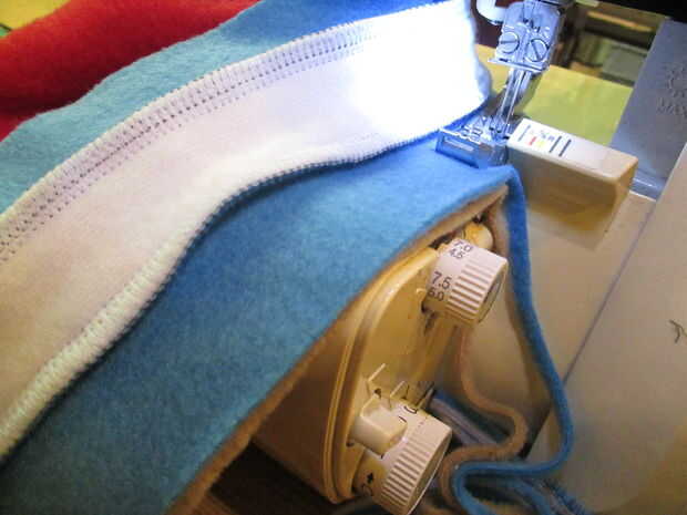 Derecho lados juntos, me serged las bandas beiges y azul/blanco, corte una buen 1/2" de la azul. A ver como construir cada capa como grueso o alto cada capa debe ser como hacer las conexiones de la receptora de sombrero, o un modelo aproximado. : )