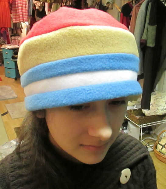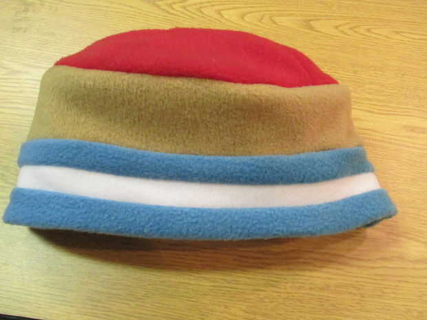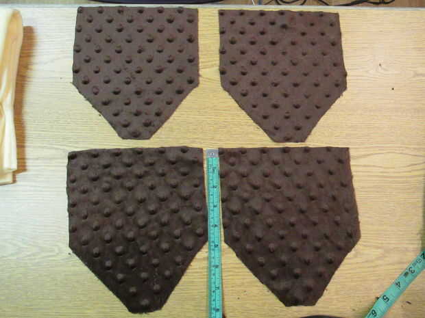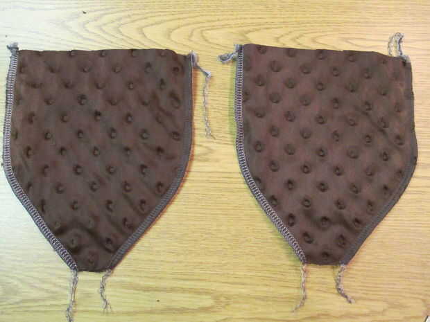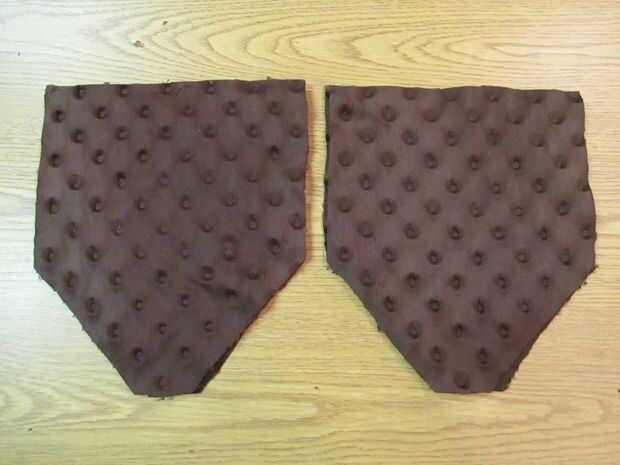 Esta súper suave tela marrón es fina, batallas y tiene que ser doblado. Cortar 4 de ellos. La parte triangular es la oreja, la Plaza de arriba irá hacia los lados del sombrero para llegar a la costura rojo/beige.