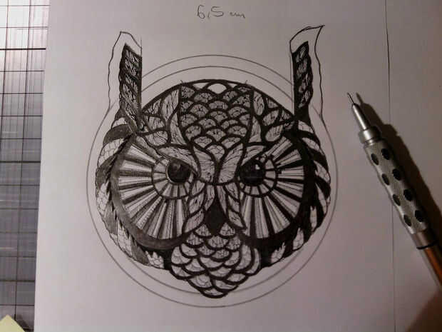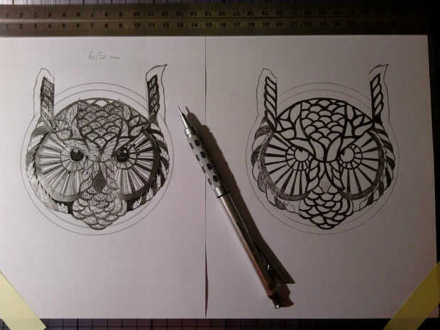 Como se puede ver su mente blowingly detallada, demasiado detallada a esas pequeñas líneas de corte con sierras de marquetería, así que debo tuve que simplificar primero a trabajar con él. El plan final sigue siendo una cabeza de buho agradable.