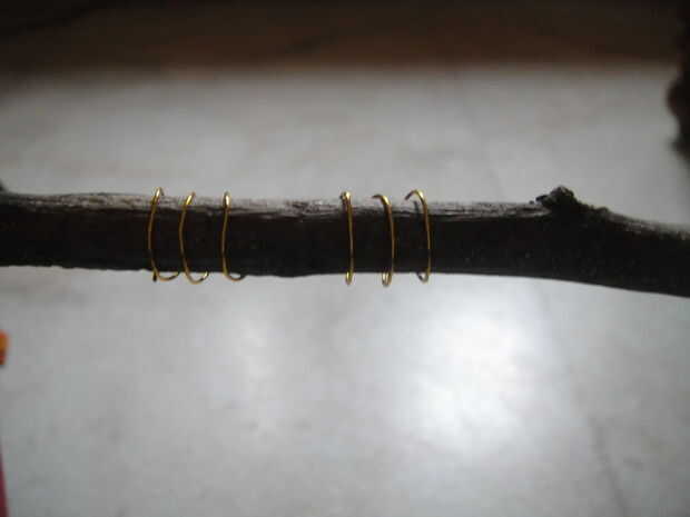 Para hacer oídos, en primer lugar tomar el alambre de metal (de 5 cm de longitud) y doblar a la mitad (ver imagen 1). Repetir este proceso y pégalos al cuerpo de la lechuza. (ver imagen 2). Para las piernas enrolle el cable alrededor de un lápiz (alrededor de 3 rondas)(see image 3). Hacer dos de ellos y viento alrededor de la ramita. (ver imagen 4).