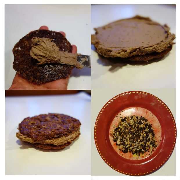 Frote la avellana tostada entre los dedos para eliminar las pieles. Deseche la piel y picar las avellanas tostadas. Picar los granos de café cubiertos chocolate en pequeños trozos y mezclar las avellanas y pedacitos de chocolate grano de café cubierto en un plato pequeño. El rodillo los bordes de sus cookies rellenas en los ingredientes picados.