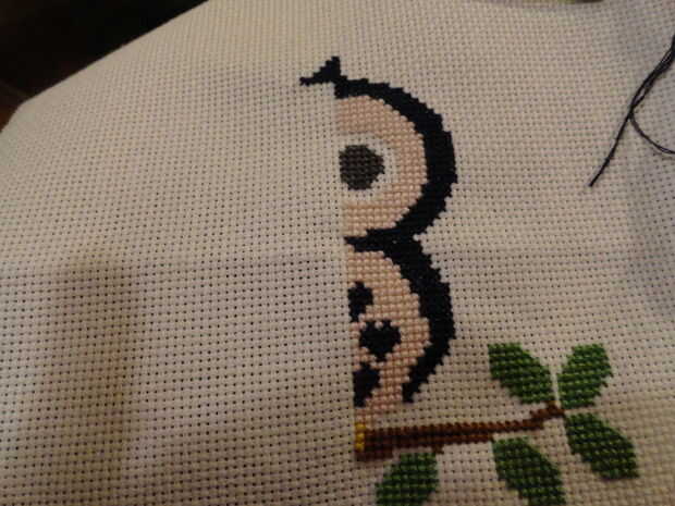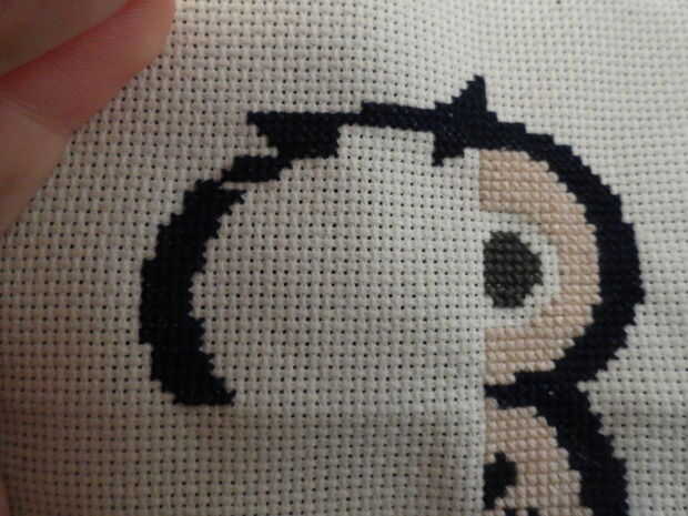 Continuar el patrón y abajo hasta que te quedas sin hilo. Una vez hecho, enhebrar la aguja otra vez y empezar a esbozar la parte morada que va a hacer. Esto hace mucho más fácil terminar este lado de la pieza. Para hacer esto, simplemente contar a los izquierda cinco cuadrados y continúe llenando el contorno. Puede hacer que el contorno grueso o tan delgado como usted quiere. Decidí hacer el contorno más grueso. Una vez que termine el contorno, terminar los cuadrados púrpura.
