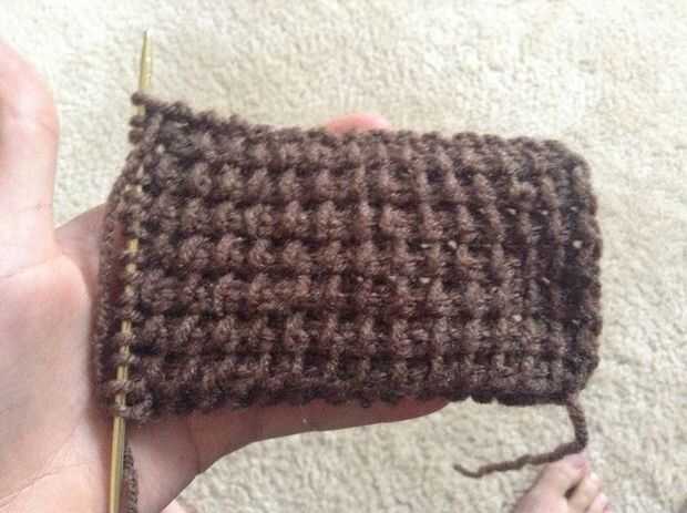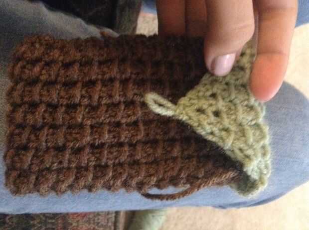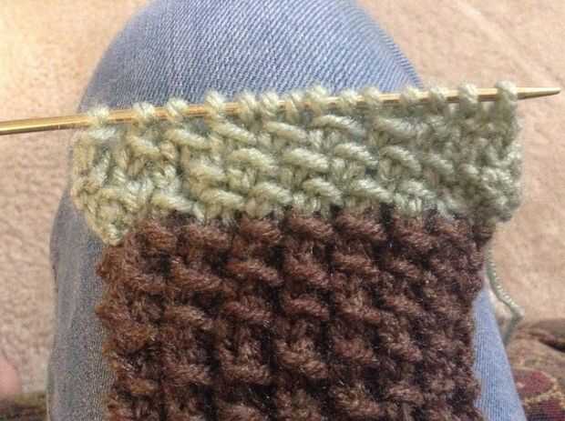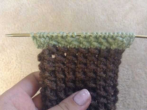 Agregar tu segundo color (estoy usando verde) y seguir el mismo patrón. KFB (punto delantero trasero) para las puntadas de borde de dos. Formar dos filas más y luego comenzar a disminuir los puntos por recoger dos para una puntada normal.
