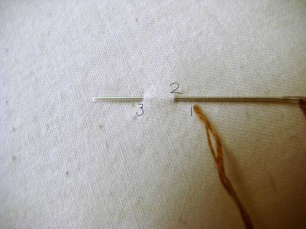 Ahora vamos a empezar con las puntadas que he utilizado.  Puntada de nuevo: es hecho por la aguja subir en el punto 1, bajando en el punto 2 y volver al punto 3.