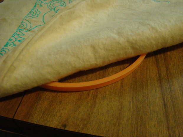 En el centro y poner la parte inferior de la mitad del bordado aro debajo de la tela y la guata.