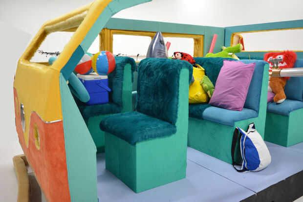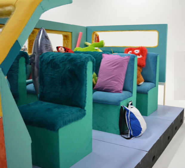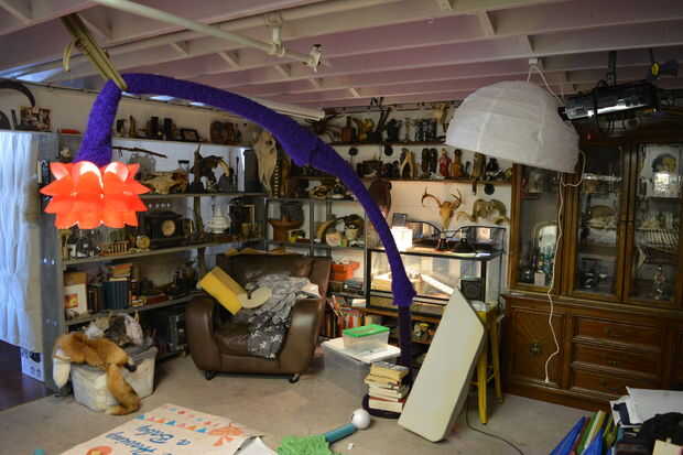 Hay una lámpara funky, que tomó tiempo sangriento, aerosol pegado rojo piel para piezas de plástico de una lámpara IKEA de la diversión. Realmente tuvo un par de días. El cuello de la lámpara fue hecho con tallarines de la piscina y algunas bufandas furry de tienda de dólar.
