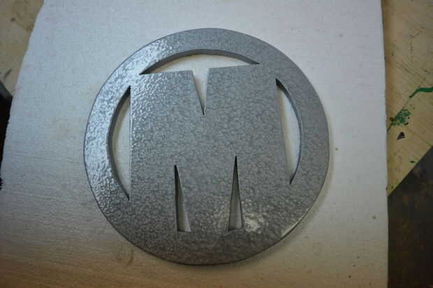 la construcción continuó empezamos a elaborar detalles sexy. El logo VW consiguió cambió a una "M". Hice esto por imprimir una imagen de una M en un círculo y luego rociar pegar en MDF. Recorte con un rompecabezas y aerosol pintado con capa Hammerite.
