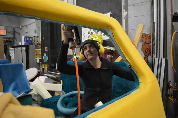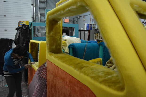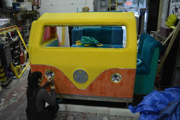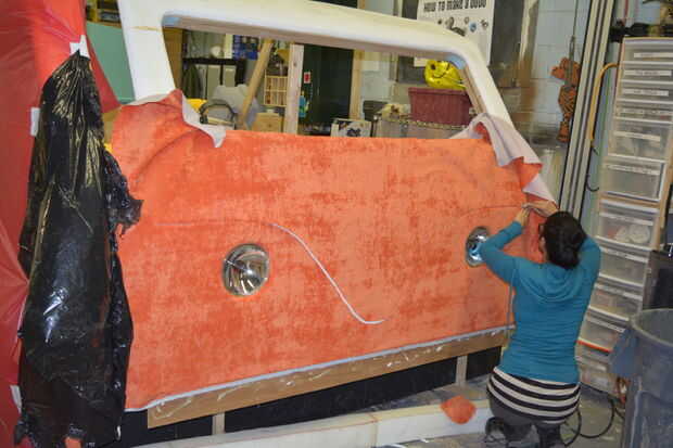 La tapicería tomó un tiempo de largas. Realmente pensábamos que iba a ser super rápido. Muchacho, hemos aprendido unas cuantas cosas. Cada pulgada cuadrada de la estructura fue cubierta en tela y todo ello requiere cuidadoso de las manos de Tina en el estiramiento y engrapado para evitar las arrugas. Nuestro buen amigo Leeanne (yay Leebags!!!!!!) vinieron encima y termina por ayudarnos con este monstruo durante unos días. Ella es una superestrella y todo el mundo debe inclinarse ante ella gravemente y decir «YO».