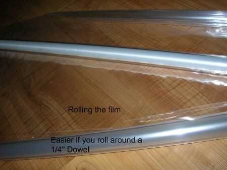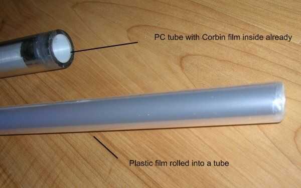 La difusión de la película que utilizo es "Corbin". Esto se llama Corbin Das, el nombre de la persona que perfeccionó el uso de la película de la difusión. Sin esta película el tubo de la pc claro va dejar que la luz pase a través de su interior y no se verá brillante. La película refleja y difunde la luz de una brillante hoja incluso. Papel de la película en un tubo que tiene la misma longitud que el tubo de la PC y deslice la película dentro del tubo de la PC. La película entonces se despliega un poco y presionar contra el interior pared del tubo de la PC. Estática tendrá la película en el interior del tubo de la PC.