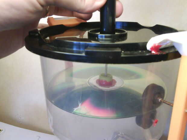 El plástico no son suficientes para mantener el eje de la rueda en la posición correcta, así perforé otro BIC-maquinilla de afeitar que actúan como una tapa de cierre y una columna de apoyo para el árbol como se ve en la foto. El truco es agregado el CD en el eje central y la rueda del juguete del hilo de rosca aunque el agujero de la carcasa y apoyar la maquinilla de afeitar mientras que usted está cerrando todo. Se siente similar a la construcción de una nave botella.