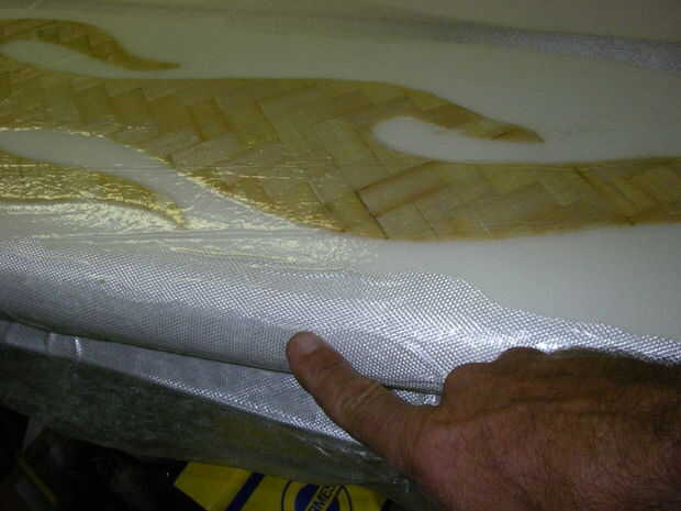 Johnny sólo pone resina en los alrededores del bambú. Él está apuntando a la zona seca de la tela. El resto de la tela quedo seco. Él a poner resina en en una operación separada. Moje completamente o completamente seco es aceptable. El problema viene cuando un layup es "hambre".