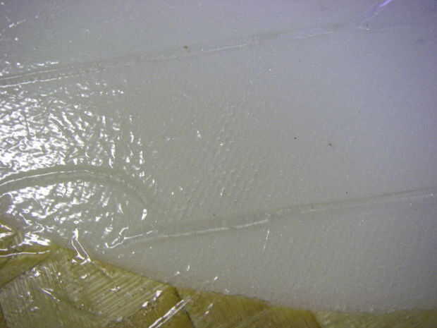 Si la bandeja está "muerto de hambre" habrá zonas de tela no saturado con resina. La segunda foto muestra una zona pequeña como esta. Si la bandeja es hambre verás el patrón del diamante de la armadura de tela. La solución es empujar en la resina y burbujas hacia fuera con una escobilla de goma.