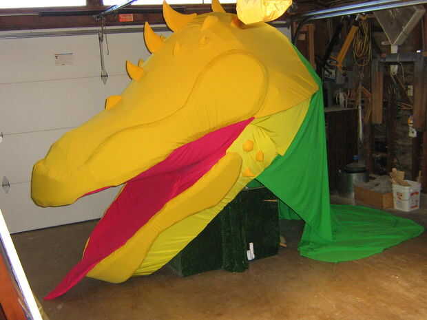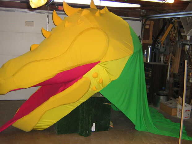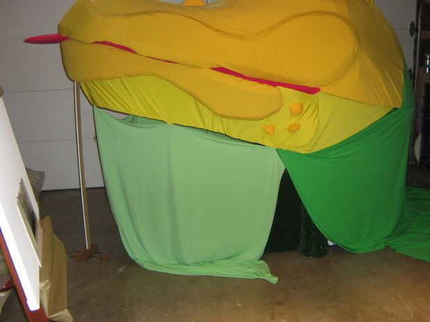 Para cubrir el titiritero y la base, en lugar de colocar directamente las hojas (16 hojas construidas como las fases anteriores) a la marioneta, fue cosida a una 'pantalla' para las porciones superiores e inferiores de la cabeza.