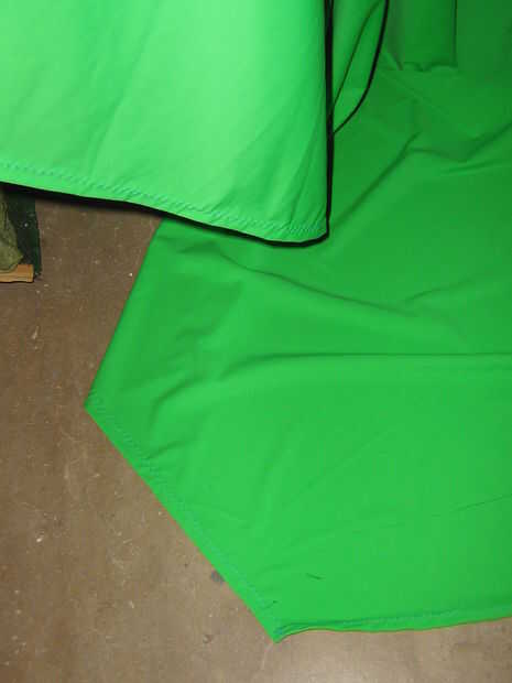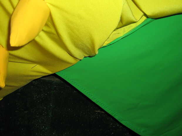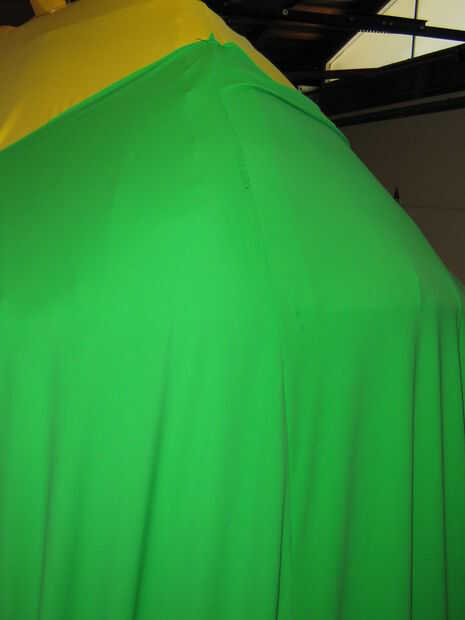 La pantalla trasera consta de dos 60" paneles de ancho cosidas por la mitad y colocado en el cabezal por medio de Velcro (gancho lateral cosida a un lado de la pantalla y lazo firmemente adherido a la marioneta con derretimiento caliente de la tela, asegurándose de que se forma un vínculo seguro con cada uno).