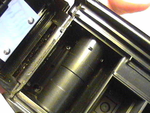 3. saque los dos tornillos ubicados en la cámara de recogida de la película (que se ocultaban por el tensor de metal). Ponga a un lado.