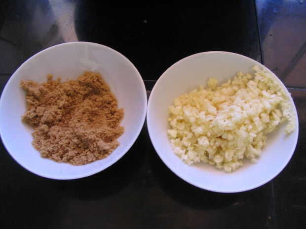 Picar un puñado grande de ajo y colocarla en un recipiente de preparación. Llenar otro recipiente de preparación con un par de cucharadas de azúcar moreno.