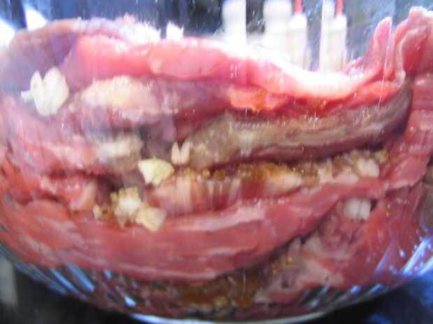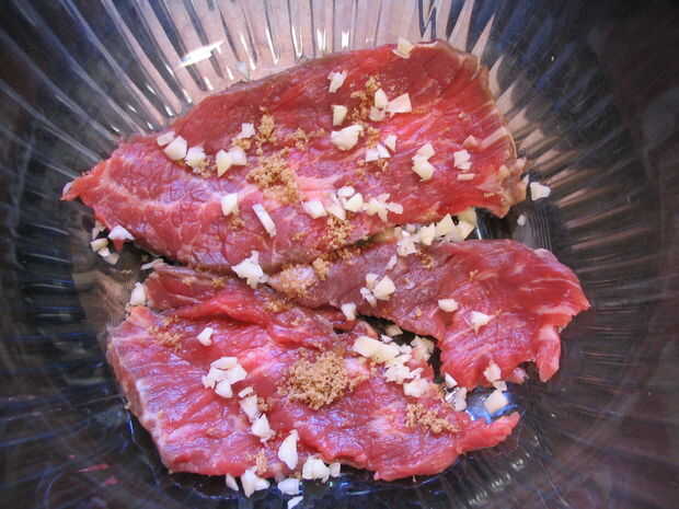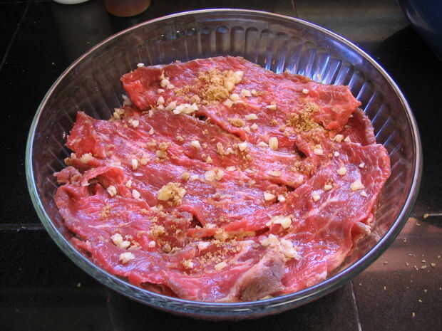 Rocíe la parte inferior del tazón de fuente con una capa de ajo y el azúcar, luego agregue una sola capa de rodajas de carne de res, asegurándose de que no se superponen.