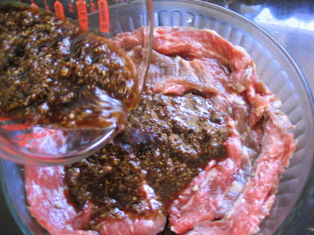 Vierta esta mezcla sobre la carne del adobo y mezclar bien. Volver la carne a la nevera durante al menos 2 horas; durante la noche también está bien. Puntos de bonificación para la mezcla en marinado.
