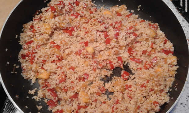Añadir el bulgur a la carne del pimentón oinion de calabaza. Ahora agregue las almendras.