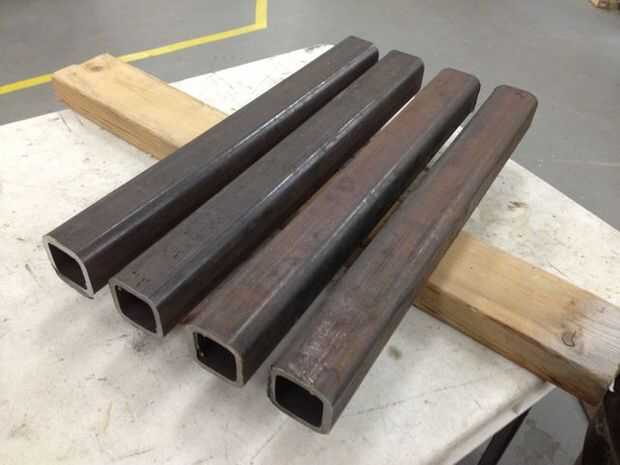 Las patas de la mesa son tubos de acero cuadrado de dos pulgadas. Los pedazos que tenía eran 36" de largo, por lo que fue fácil de cortar por la mitad para hacer las cuatro piernas que eran 18", una buena altura para una mesa de café.