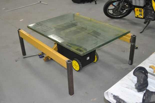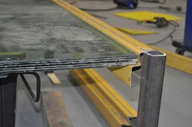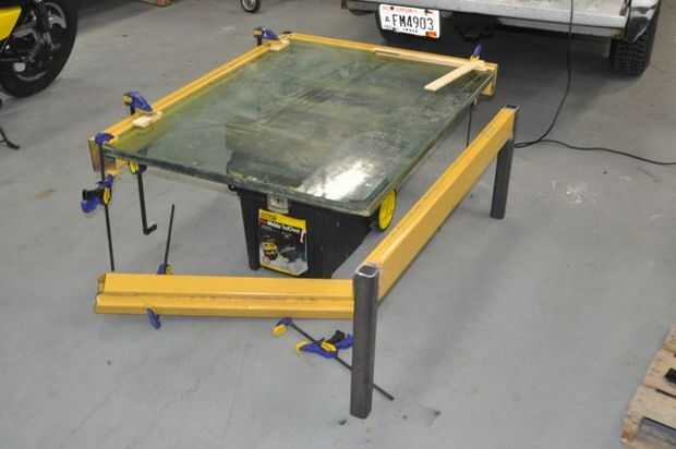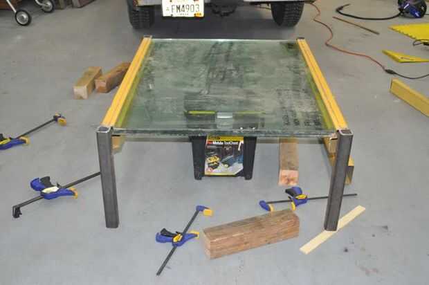 Con el vidrio apoyado en una caja de herramientas grande, pude poner los dos rieles alrededor de él un áspero hasta la forma de tabla. I fijar las dos piezas laterales más cortas en lugar y tachuela-soldó con autógena los.