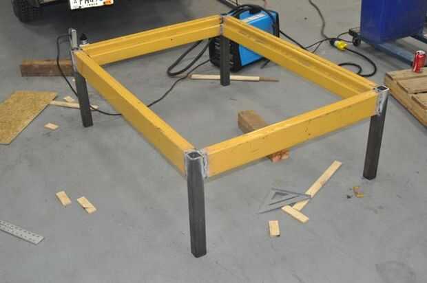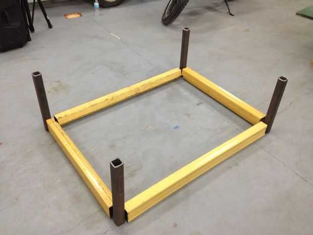 Puso uno de los lados más largos en el piso y poner una pierna en cada extremo de la misma. Entonces comprobé de Plaza y tack-soldada en su lugar. Todas las soldaduras en este proyecto fueron sólo tack-soldaduras hasta que me dieron el marco en ha terminado de forma básica. Así, cuando me cagué, es fácil de moler rápidamente una pequeña soldadura o dos para deshacerlo.