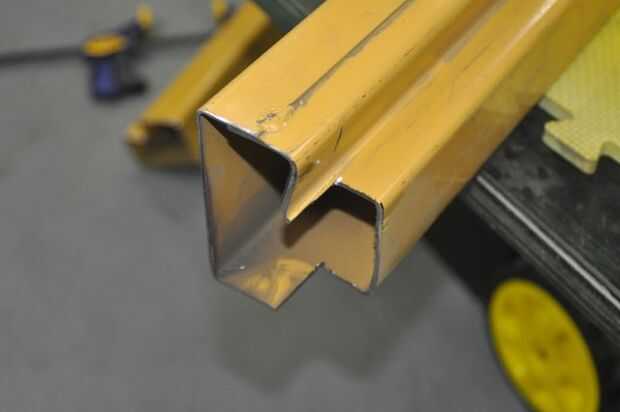 Los dos lados más cortos no serán capaces de avanzar sin "dentro de labios" golpear en la otra pieza. Por lo tanto, sobre las dos piezas del lado corto, utilizar la amoladora angular para cortar una muesca de 1" en el labio. Con eso quitado, el interior soporte labial envuelve todo el camino alrededor de la mesa.