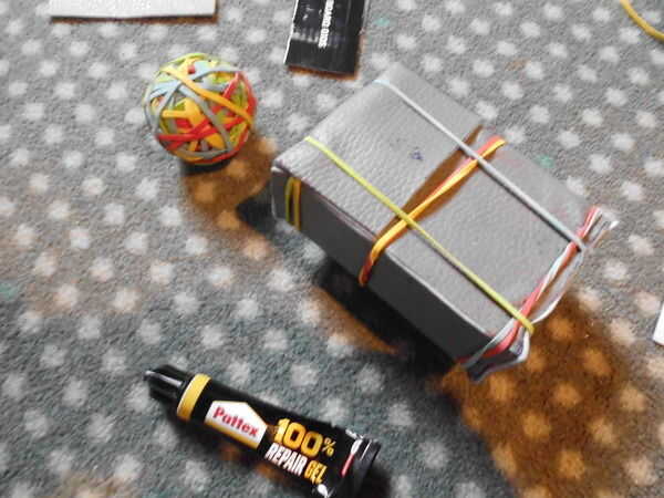 Envuelve unos anillos de goma sobre la caja, para que el pegamento se seque.