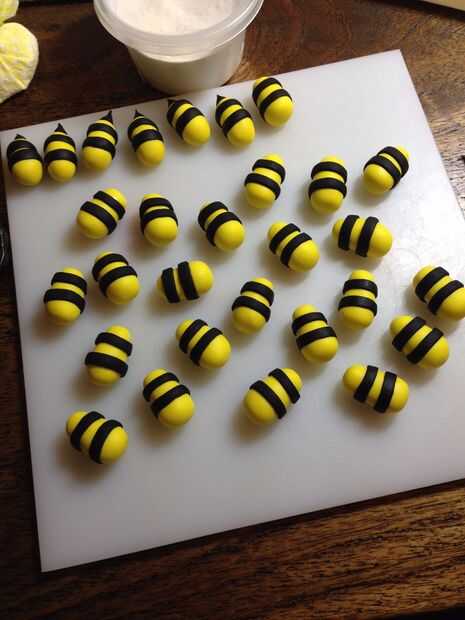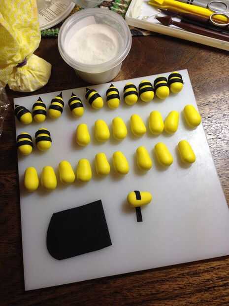 • Rodillo el fondant amarillo en pequeñas formas de haba/pera de jalea.